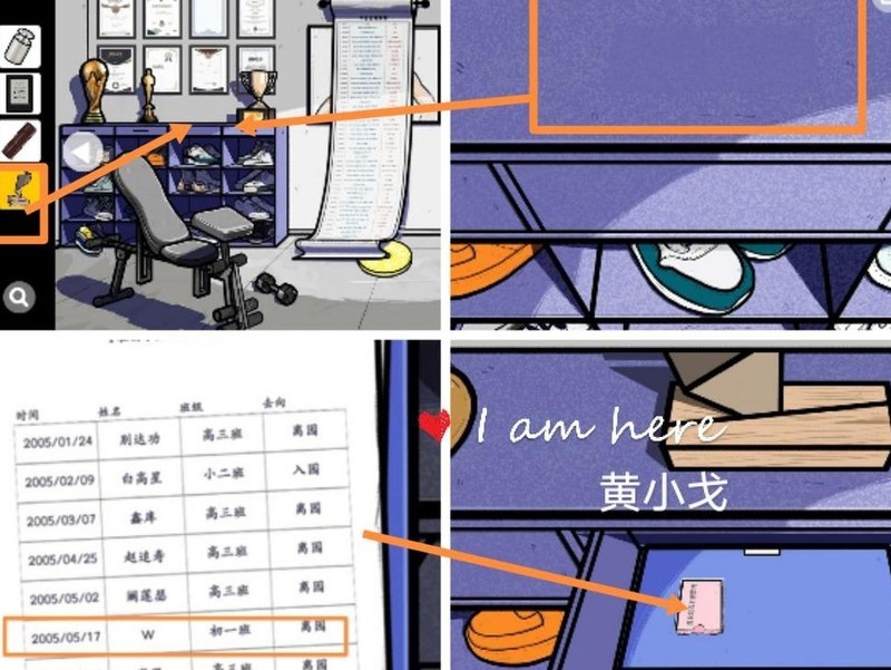 在一楼健身房,将金奖杯放入鞋柜上方的奖杯位置,随后查看花名册,发现一条线索:2005年5月17日。