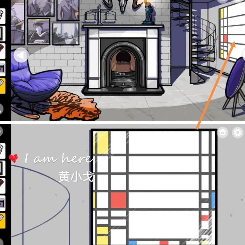 在一楼带壁炉的房间,点击旋转楼梯旁的格子画,记下三种颜色对应的数量:黄色6个、红色3个、蓝色2个。