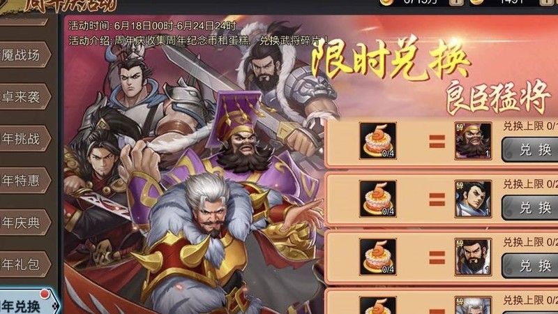 大型活动期间限时兑换:每逢重大更新上线新武将,玩家可用当期道具兑换指定角色。若不想要新武将,也可选择兑换即将抽到的旧武将,灵活满足不同需求。