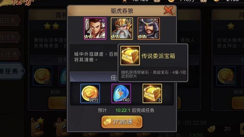 游戏中有两种宝箱可获得皇冠武将碎片,玩家通过完成日常任务和参与限时活动即可获取大量宝箱。其中,传说委派宝箱奖励尤为丰富,常能开出3个皇冠武将碎片,深受新人玩家喜爱。需注意的是,目前仅5星武将以及绝大多数皇冠武将拥有专属的委派任务,其他武将暂无此类产出途径。