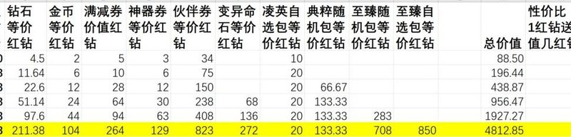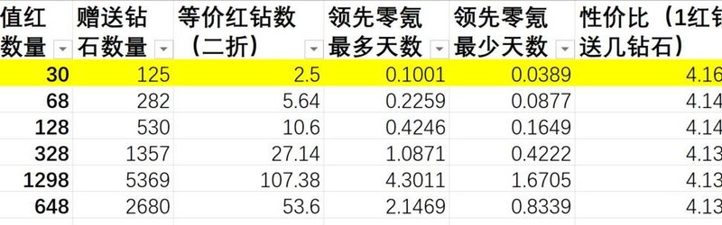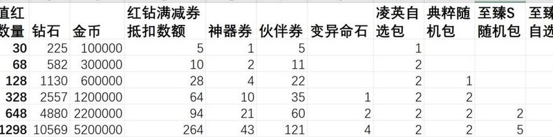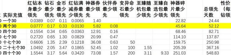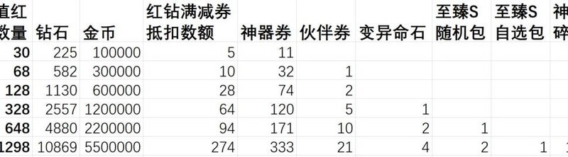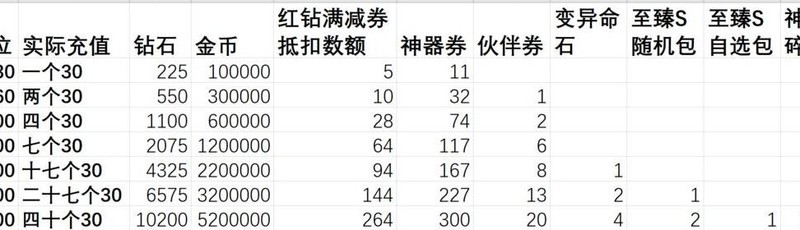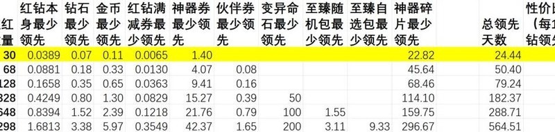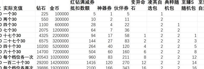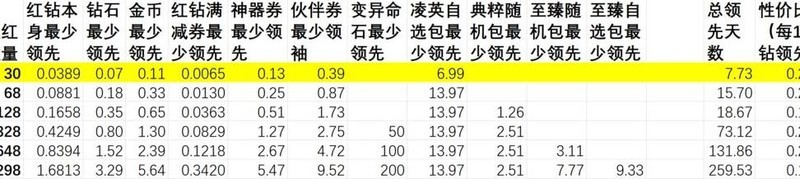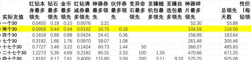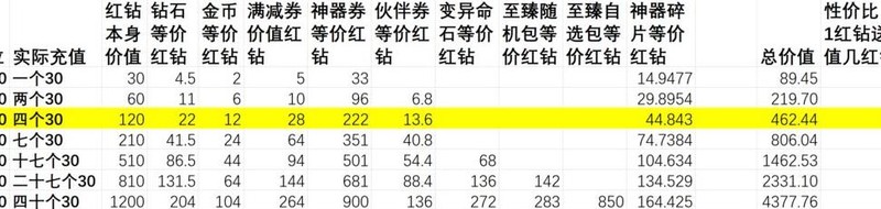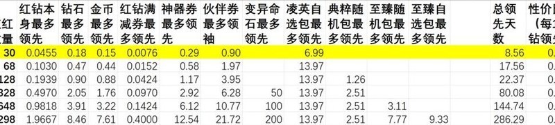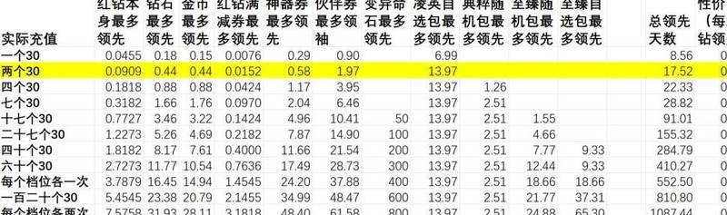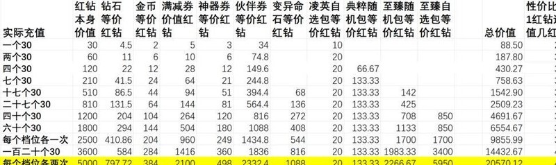 充值赠送内容的实际价值超过红钻本身,选择循环活动档位充值比直接购买红钻更划算,投入越少单价优势越明显。神器相关活动带来的领先幅度大于伙伴券活动。尽量将充值额度凑成整数,若无法凑整,优先选择多次30元充值,每张图中标注亮色的部分代表性价比最优档位。