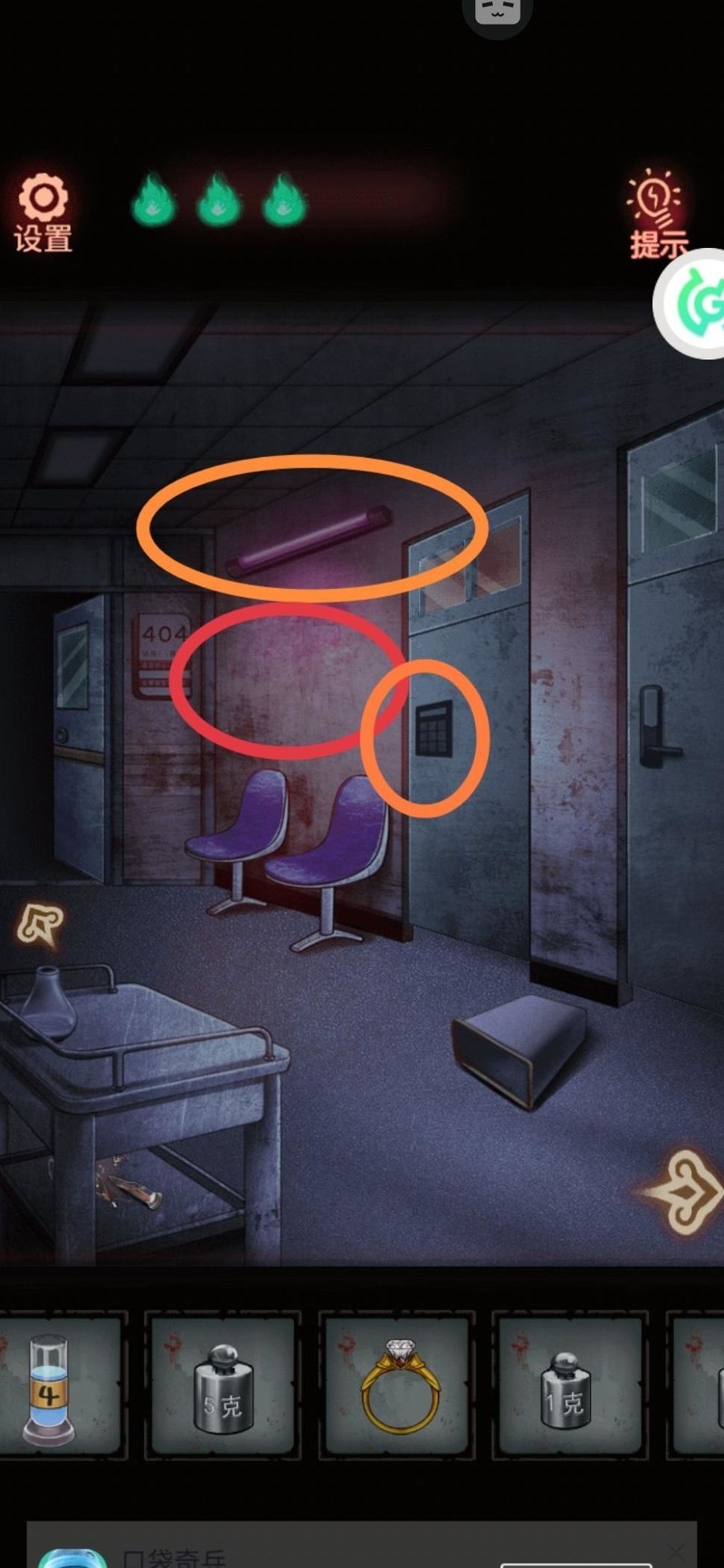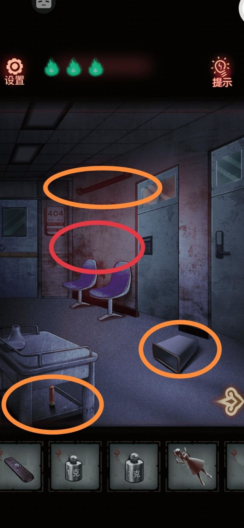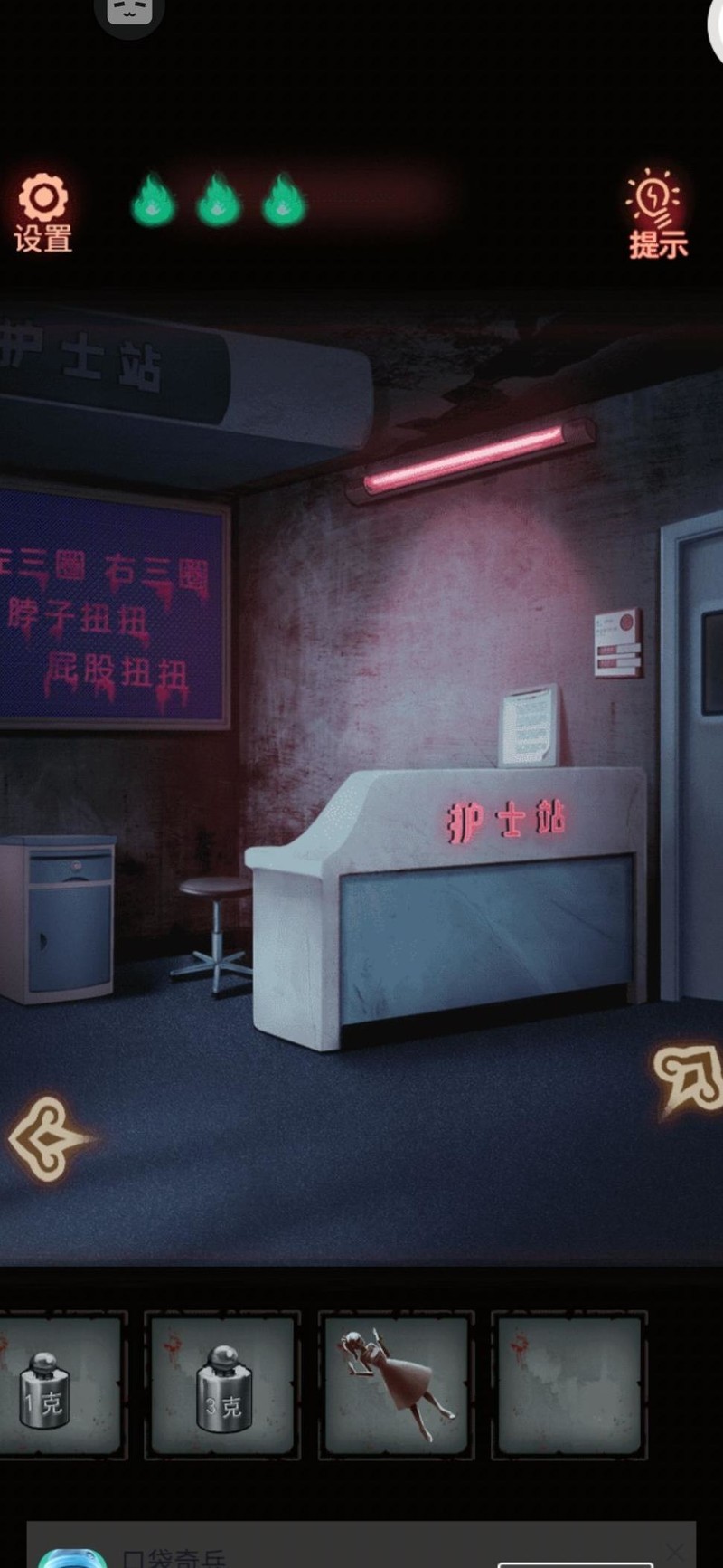 沿着左侧走廊走到404病房,却发现门被锁上了,必须先找到钥匙。焦急中我不慎踢翻垃圾桶,意外捡到一个遥控器,似乎是护士站显示屏用的。返回操作屏幕,起初画面正常,最后却出现诡异文字,要求我们一起做早操,左三圈右三圈我照着提示,将柜子上方抽屉的旋钮持续向左旋转三圈、向右三圈,中途不敢松手。柜子终于弹开,里面是一把造型奇特的不开心钥匙(?⌒`)。用它成功打开了404病房的门。