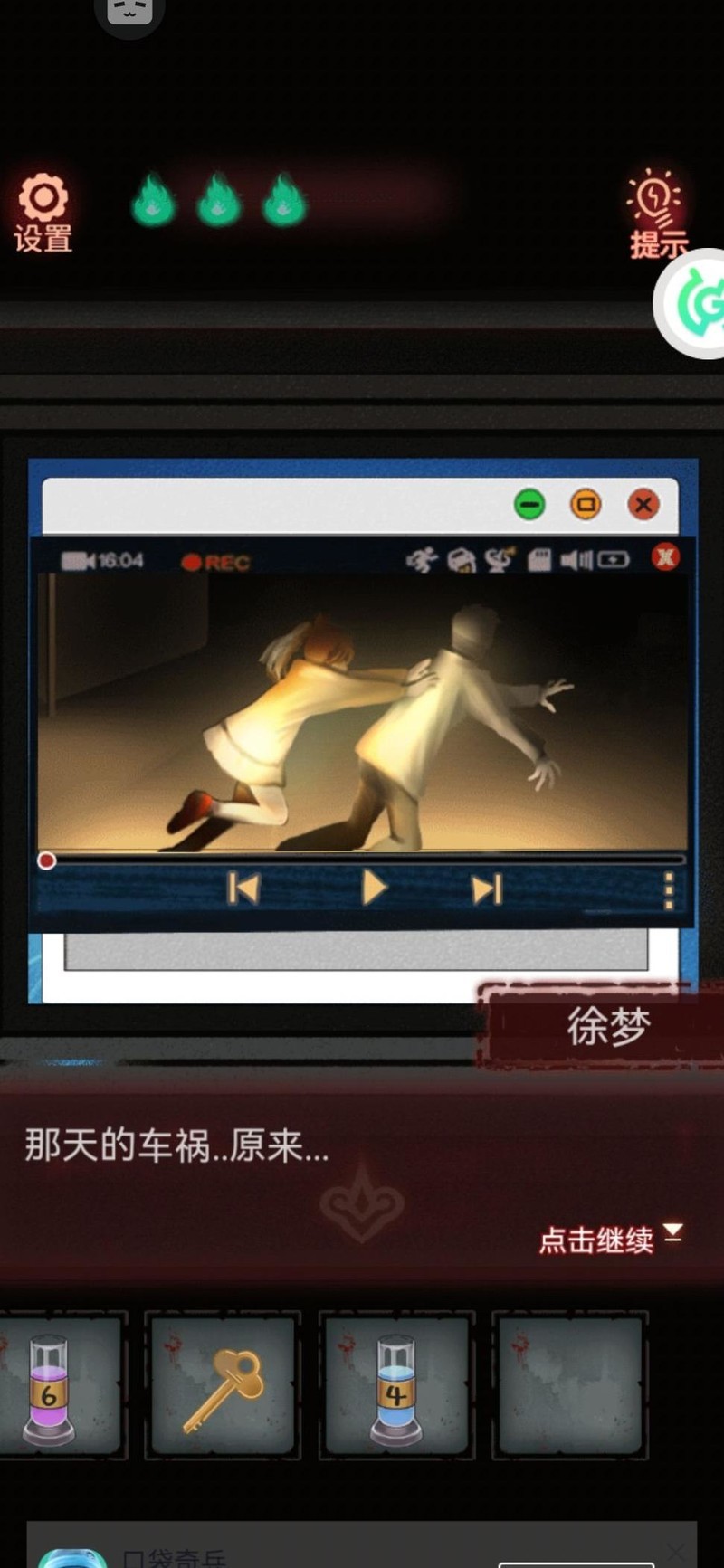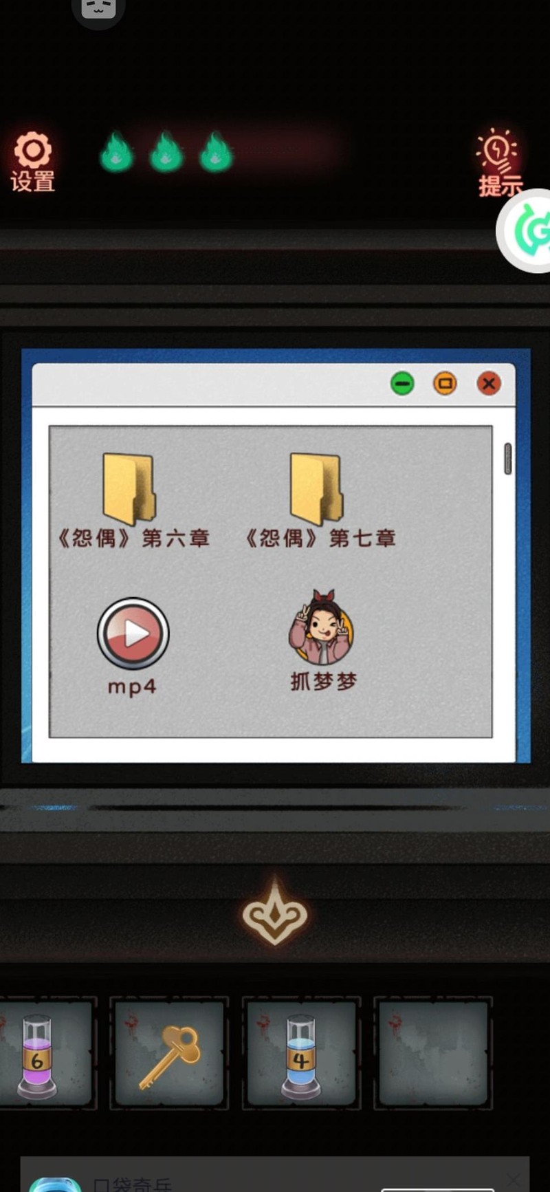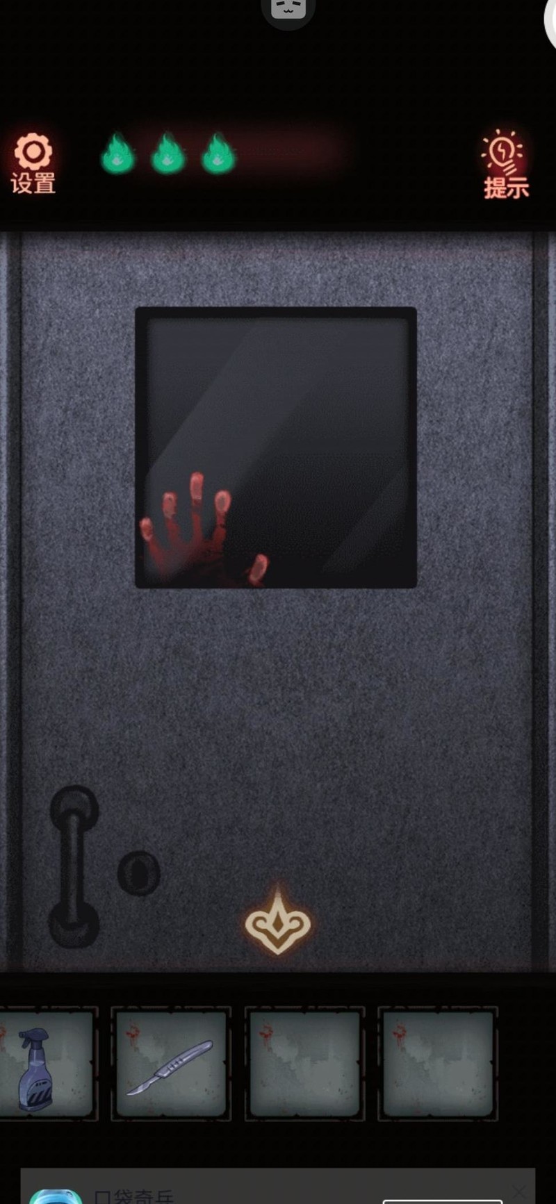 沿着左侧走廊走到404病房,却发现门被锁上了,必须先找到钥匙。焦急中我不慎踢翻垃圾桶,意外捡到一个遥控器,似乎是护士站显示屏用的。返回操作屏幕,起初画面正常,最后却出现诡异文字,要求我们一起做早操,左三圈右三圈我照着提示,将柜子上方抽屉的旋钮持续向左旋转三圈、向右三圈,中途不敢松手。柜子终于弹开,里面是一把造型奇特的不开心钥匙(?⌒`)。用它成功打开了404病房的门。