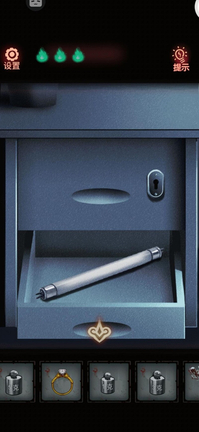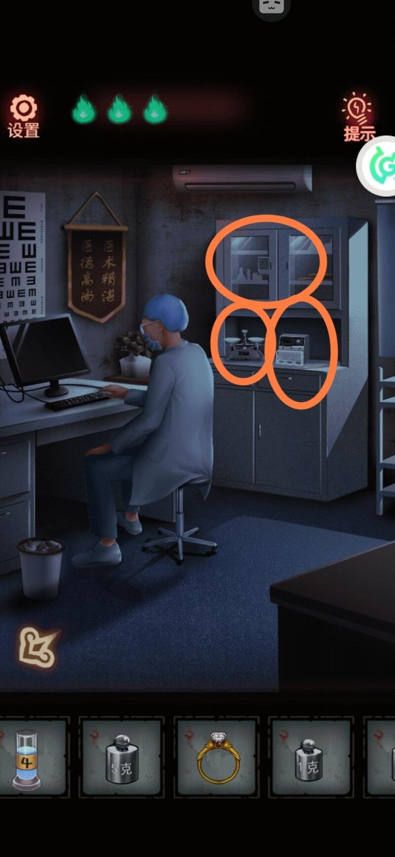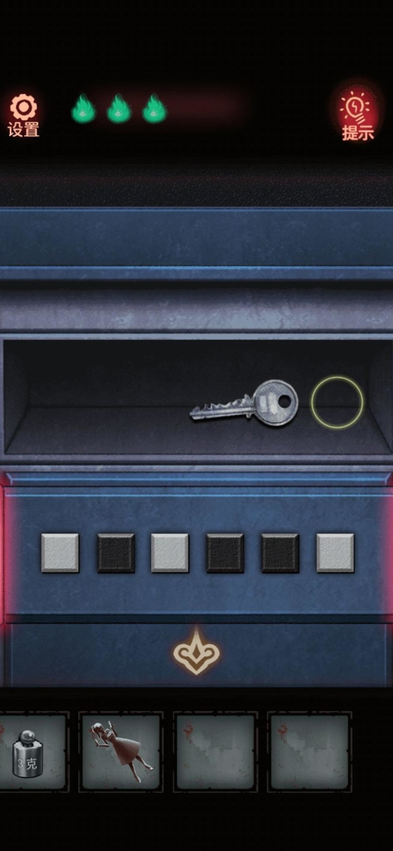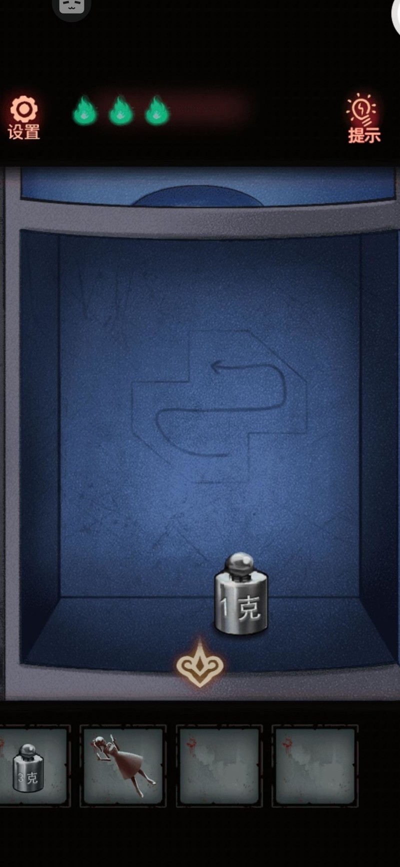 搜索柜子,上方无法开启,先从下方取得砝码,留意后方图案并暗自记下。