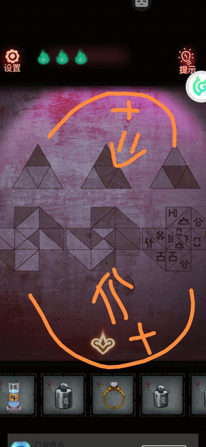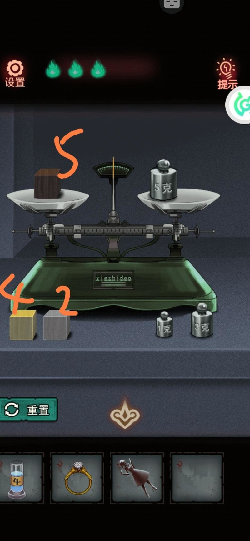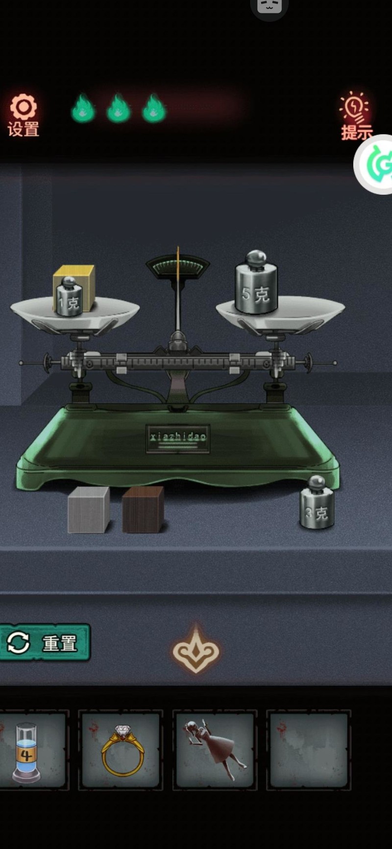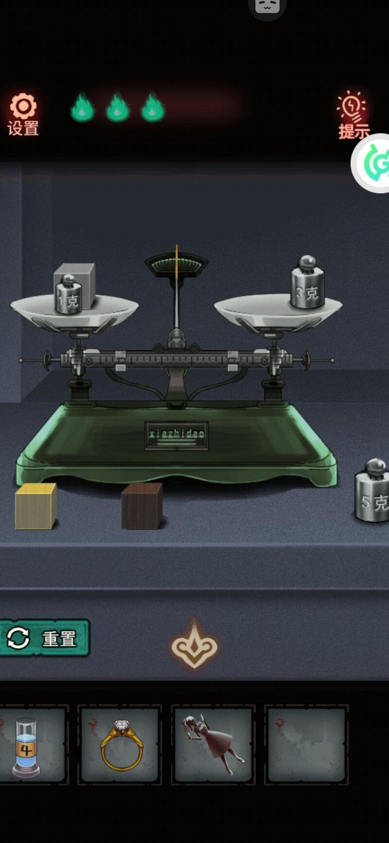 搜索柜子,上方无法开启,先从下方取得砝码,留意后方图案并暗自记下。
