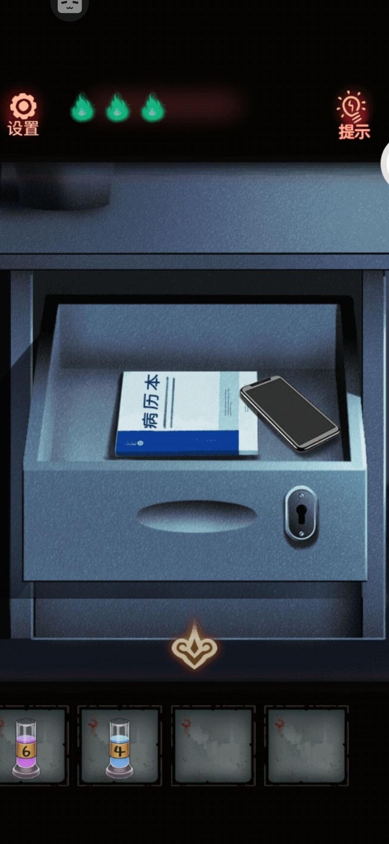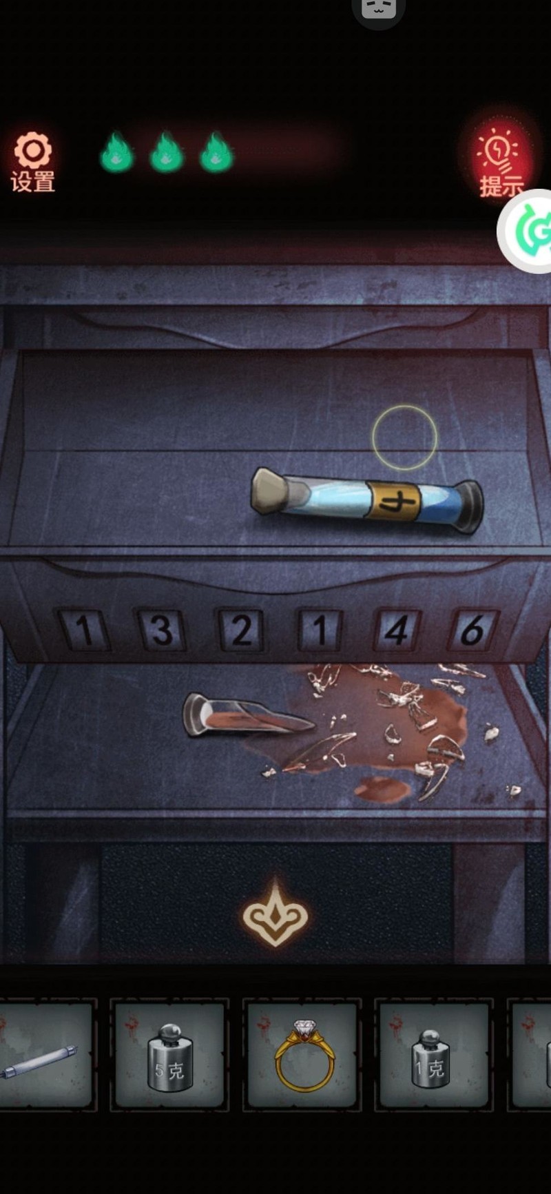 离开前见护士敲试管,依次为一下、三下、两下、一下、四下、六下。推车上试管摆放的顺序,或许暗示着密码132146,据此成功取得特效药4号。