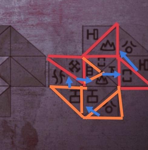 上方三角中第一个与第三个黑色图案组合成第二个黑色图形,下方同理,依此规律可推导出第三个图案,整体共六个三角形与六个符号,布局对应。