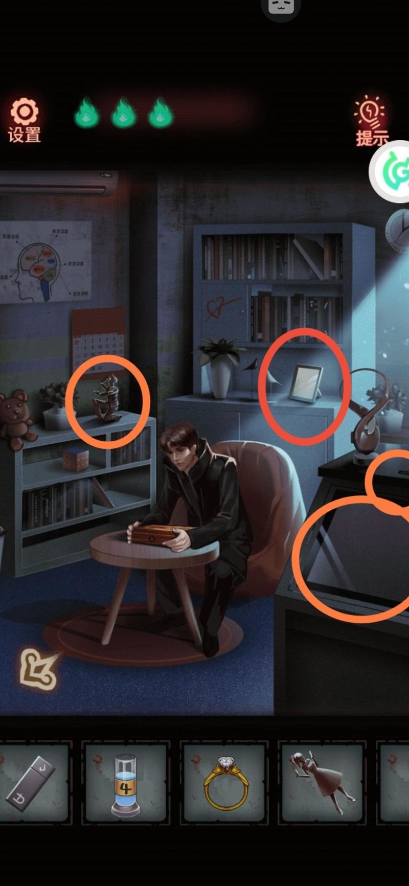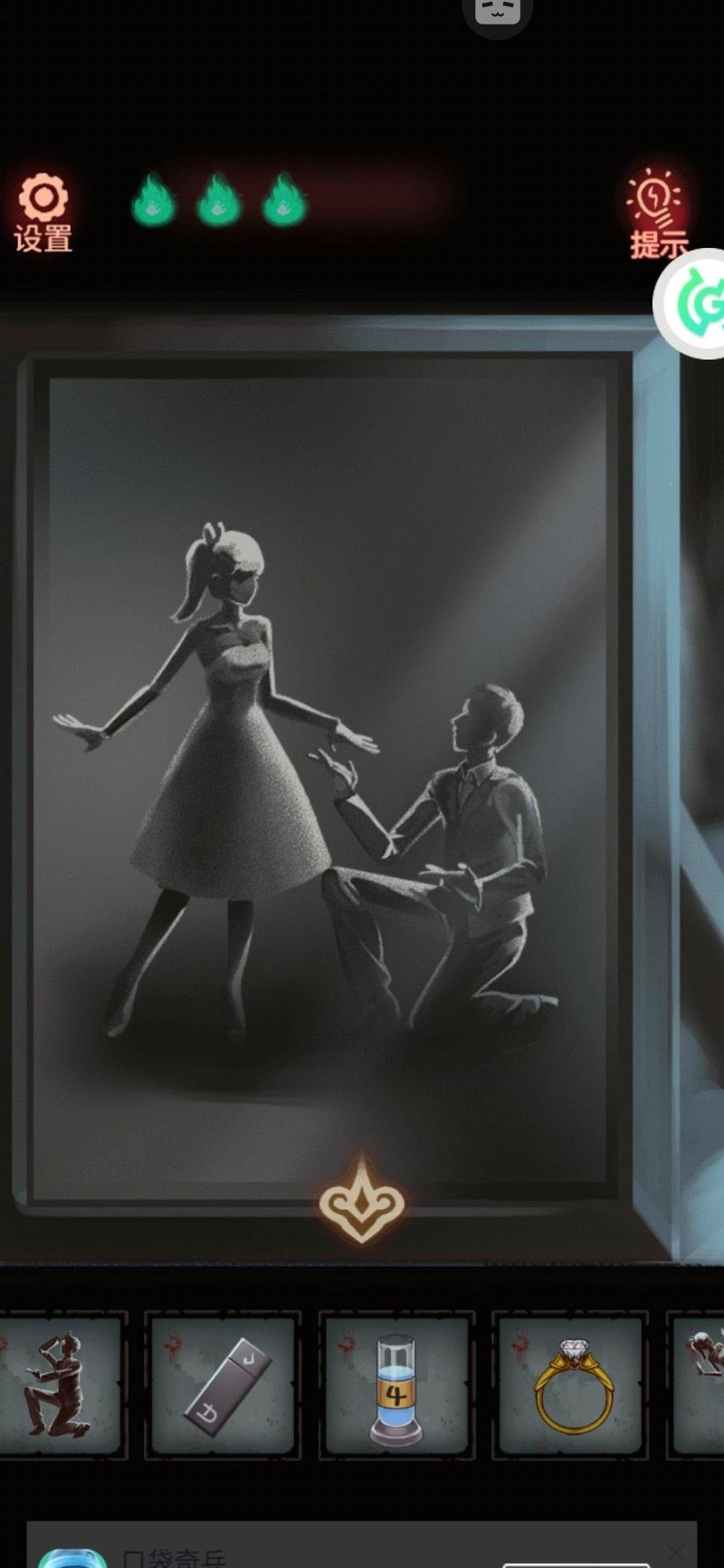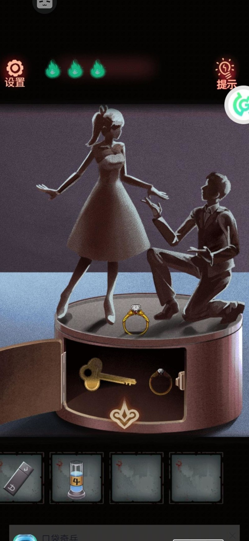 返回404病房,将两个娃娃与戒指装在窗边桌上的八音盒上,依照照片摆好姿势,开启盒子后取得男戒和钥匙。