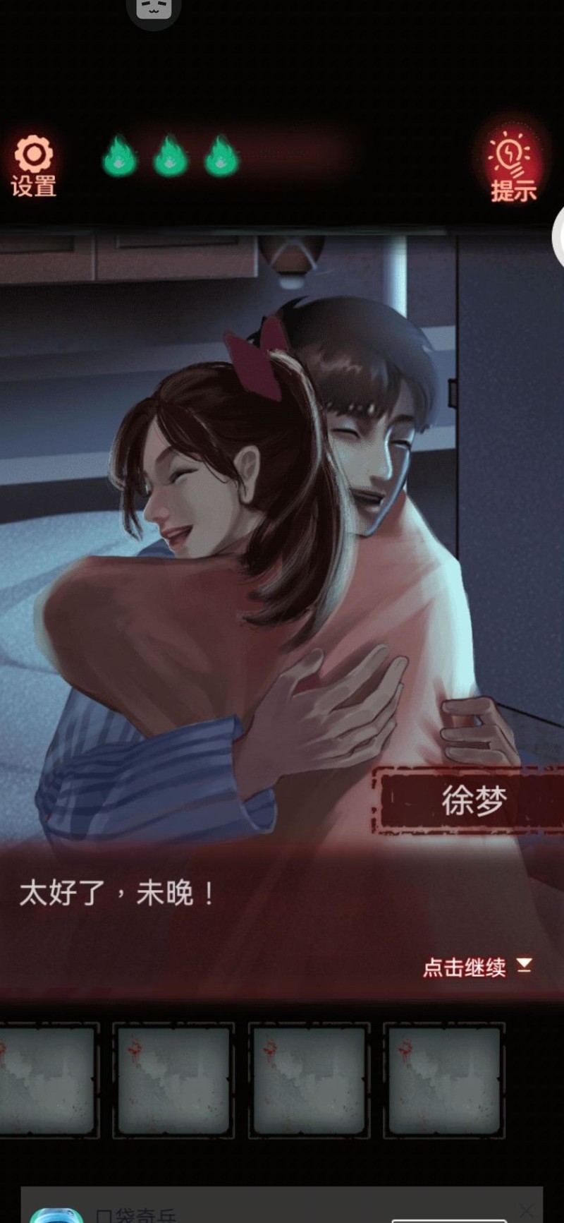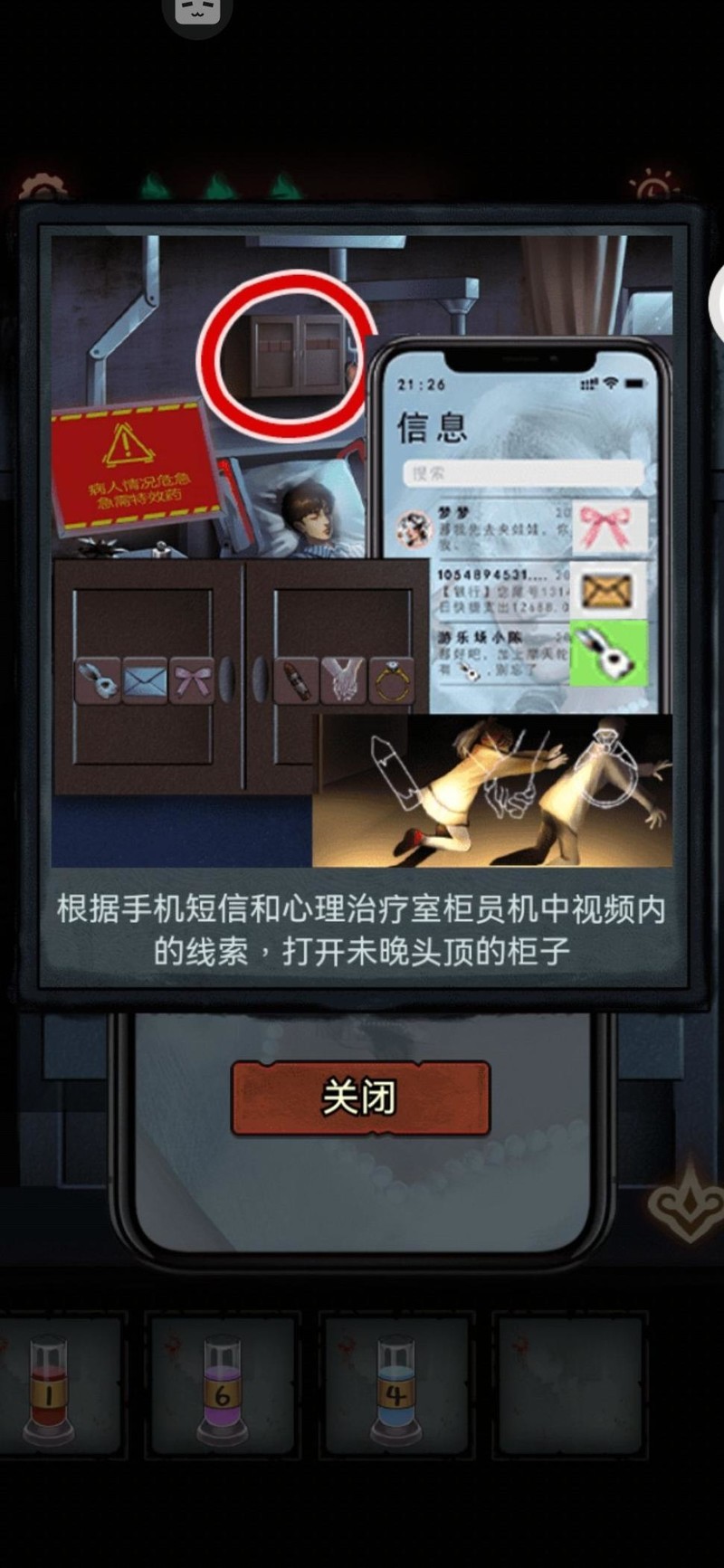 拿着钥匙回到404房间,床头柜抽屉里放着病历本和手机。病历本记载了未晚的病情,末尾夹着一张写有配方残页的纸,背面是手机解锁密码。手机解锁后显示三条短信,每条都带有一个表情符号,按时间顺序依次是兔兔、信封、蝴蝶结。