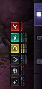 战斗中右侧可见状态栏,未点亮的图标代表增益效果尚未激活,示下方三个技能。