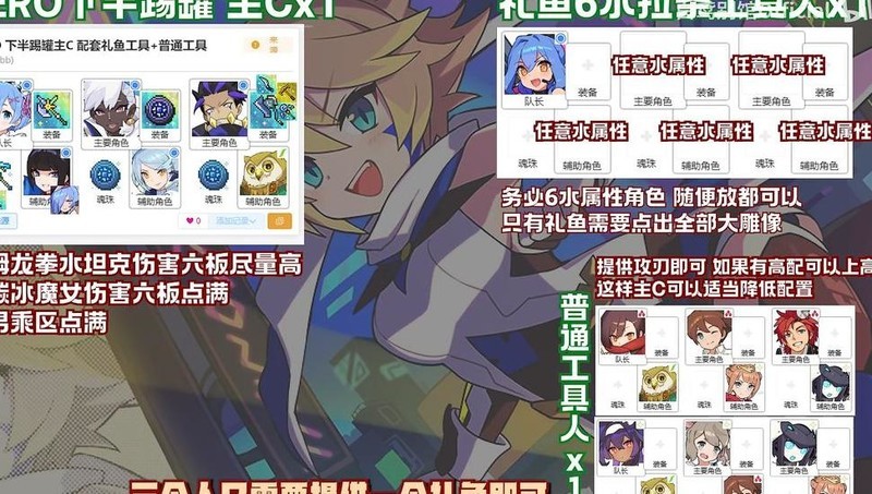 该阵容在缺少礼鱼时作为替代方案,通过雷属性角色强行启动Fever状态,整体配置较高,可有效替代原有单礼鱼搭配五水角色的Fever启动组合,适用于多种高配队伍循环。