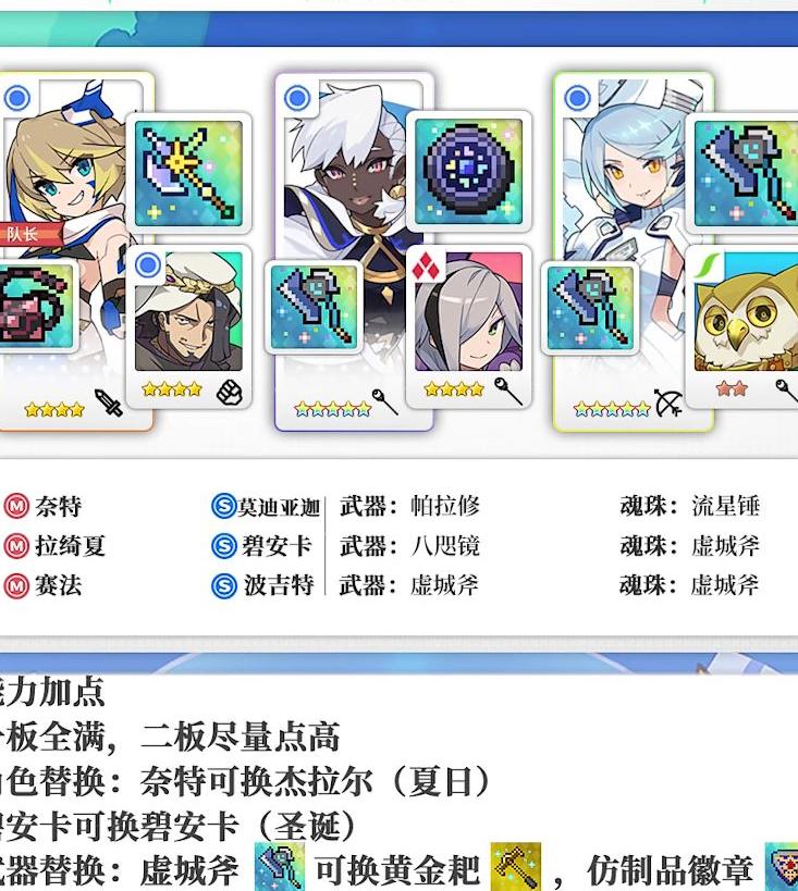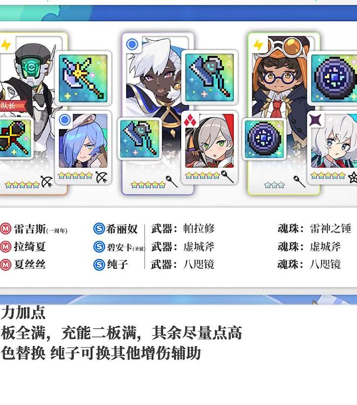 尽管水属性占优,但挑战难度并不高。据小白鸢所述,光属性同样能轻松应对。总体来看,各属性的踢罐阵容都值得尝试。此处附上棉被的配队方案,大家可根据自身情况灵活调整,即使使用铃铛角色,也建议确保开局能量充满,只要不卡主C,输出完全无忧。