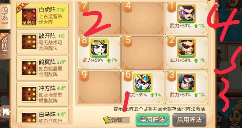 可用典韦搭配白虎阵出战,若输出不足可换白马或八卦阵。乐进与邓艾的位置可根据个人习惯灵活调整,一队成员替换自由。