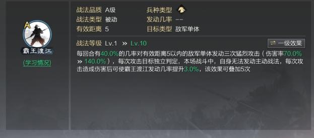 有40%概率触发,可发动三次。按最低发动率计算,期望值为420%乘以0.4,即168。实战中,孙策通过普攻、分兵、重骑反击或技能自身都容易叠满五层,因此实际收益通常远超理论值,整体输出表现更为可观。