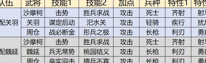 沙摩柯需避免攻击其他目标,以提升周仓在大营输出的概率,因此不再携带主动类伤害战法。通常从、、、中选择两个技能搭配使用。需注意与的属性加成效果会相互冲突,建议不要同时装备。同时,应将兵种转为死士,以进一步强化整体作战能力,确保战术执行稳定高效。