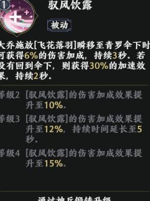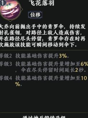 大乔除位移外,还拥有伤害技能姹紫嫣红及无双技青影风华。