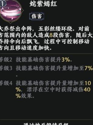 技能姹紫嫣红可对前方区域敌人发动八次伤害,随等级提高,不仅基础伤害增强,减伤效果也同步提升。