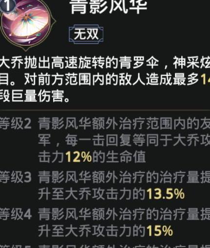 无双技能青影风华具备强大的范围伤害能力,堪称终极绝技。随着技能等级提升,不仅能造成巨额输出,还可为自身及周围队友恢复生命值。这使得大乔在60人势力大战、3v3竞技对决或野外争夺BOSS的混战中表现尤为突出。无论担当主力输出,还是充当团队支援角色,她都能发挥出色作用,进可攻退可辅,战术价值极高。