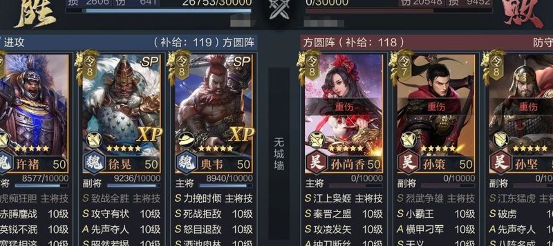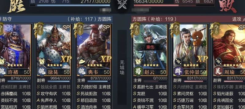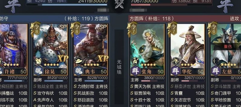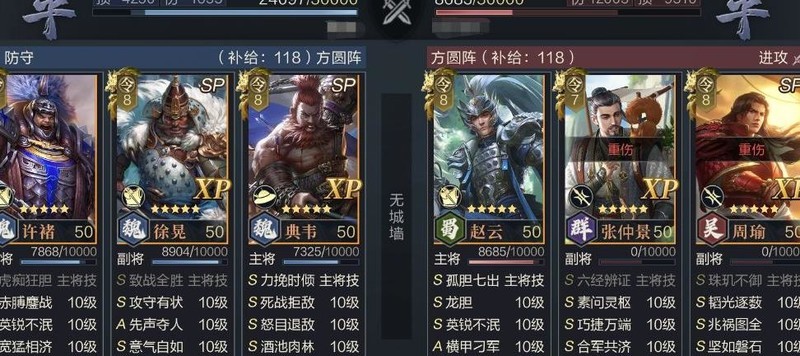该阵容核心与此前推荐的陷阵队相似,依靠SP典韦的嘲讽与SP徐晃的包围效果实现增伤减伤,区别在于用许褚替代张郃作为主输出,SP徐晃则转为辅助角色提供支持。