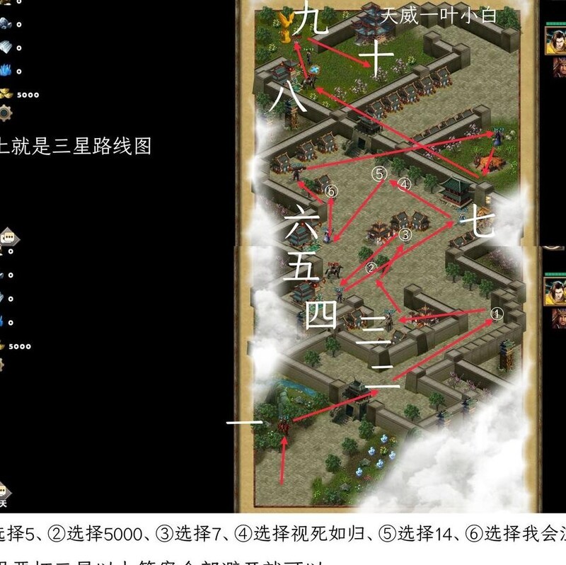 开局阶段先不要激活任何卡片,将身上携带的兵力全部弃掉(因三星通关要求战斗无损伤)。随后与吕布展开对话,选择拒绝交出物品,紧接着与其对战。击败吕布后向地图内部推进,途中会遭遇曹植。遇到第一位农民时,需选择与常规攻略图示中不同的选项,方可触发隐藏英雄的出现。与这些地图上的英雄逐一交战并击败他们。此时地图仍允许招募一名额外英雄,建议反复刷新直至获得理想的英雄配置,以便更轻松地达成三星条件。完成所有英雄战斗后继续深入,沿途注意拾取属性增益道具。再次与曹植交战并取胜后,张辽将会登场,这是本关最后一场战斗。在迎战张辽前,可激活卡片并招募农民作为炮灰单位协助作战。尽管此战难度为两星半,但只要全程无兵力损失,最终仍可顺利实现三星通关。