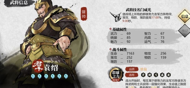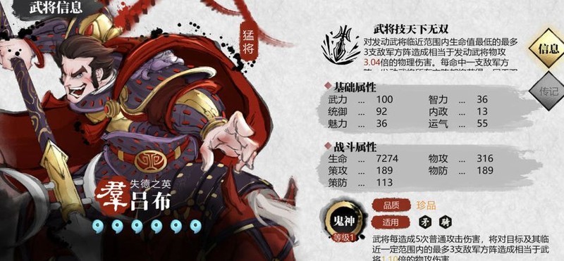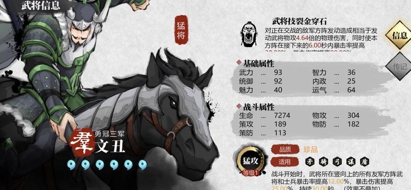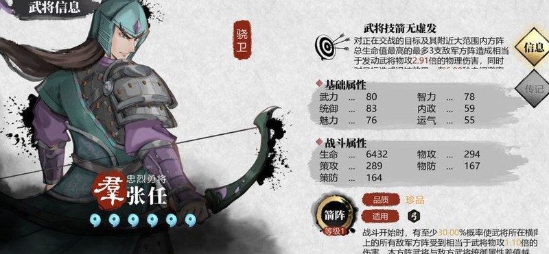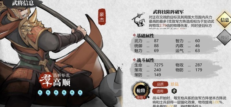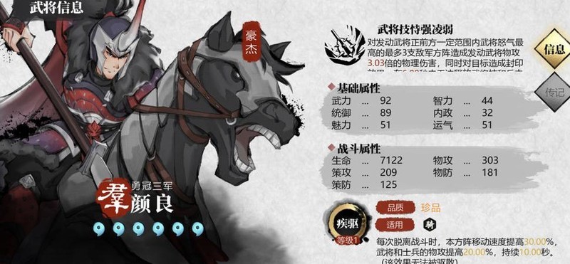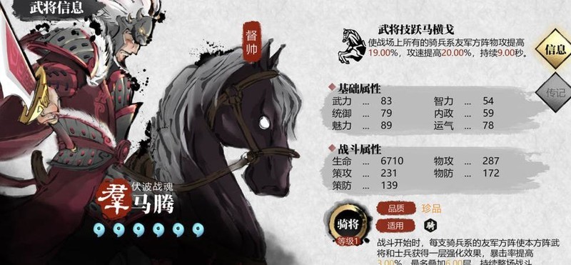 顶级骑兵将领,骑兵阵容核心,唯一不足是属性稍弱。