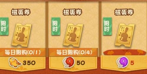 每次扭蛋需消耗一张扭蛋券,可随机获得一个彩色扭蛋及一枚扭蛋币。