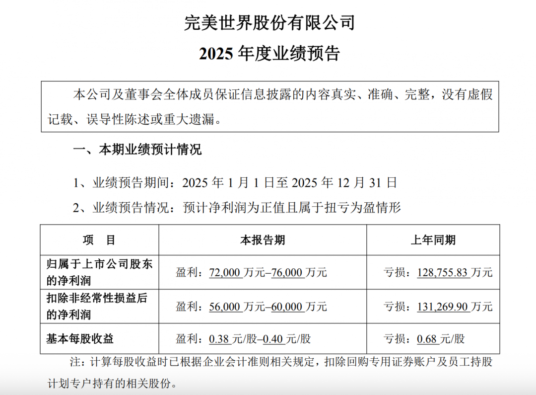 2026年1月30日,完美世界发布2025年度业绩预告。过去一年,公司围绕业务聚焦、组织效能提升与资源优化配置持续深化改革,整体经营呈现稳健向好的发展态势。预计全年实现归属于母公司股东的净利润7.2亿元至7.6亿元,扣除非经常性损益后的净利润为5.6亿元至6亿元,较上年实现扭亏为盈。