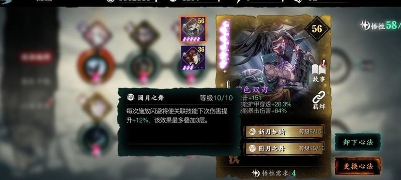 碧月提供暴击伤害加成,其绝技在闪避后可提升技能伤害,因此可在输出前通过三次闪避触发增益。搭配同样具备暴伤加成的摧枯副心法与孤锋效果,进一步强化爆发。所有副心法建议均配备武学技能,确保基础属性足够扎实。装备方面,钻心戒配合冰山实现减速(永夜),魔堡降低敌方攻击,蛇女附加中毒,技能附带眩晕与燃烧效果,并常驻五层独立增伤,总计达50%。当前极限一拳伤害可达1.05亿,日常状态下攻击力为7500,暴伤380,若由高手操作,输出还将更高。