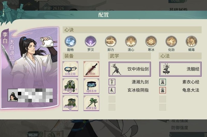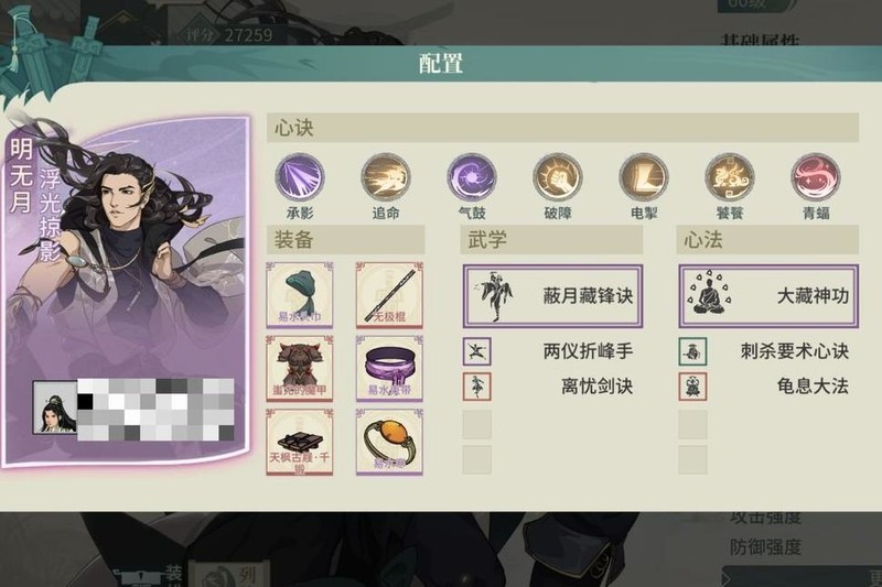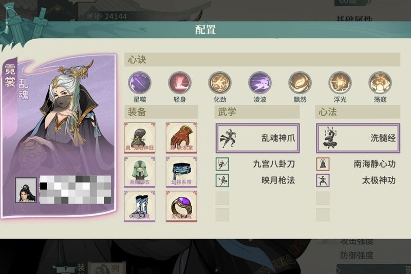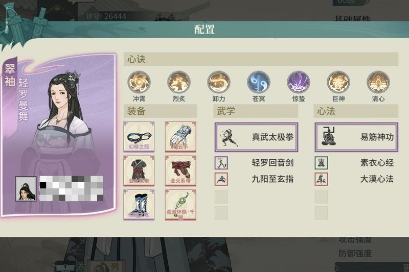 选用不吃龟息且契合气宗的太极翠秀,饰品主洗根骨,腰带侧重身法,减伤可达六成,心决选择有限,搭配火流刮痧,整体仍有提升余地。