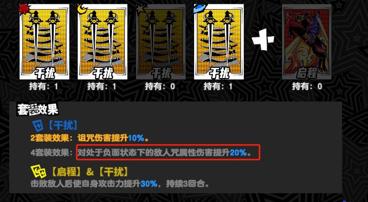 以Joker为例,咒属性角色对暴击和伤害加成都比较依赖,因此在配卡时可以选择干扰+启程两张功能卡。月位可选择提升伤害或攻击力类的卡,星位则搭配暴击率或暴击伤害属性,辰位以增强攻击力为主。由于李瑶玲具备降防能力,可为Joker创造输出环境,因此Joker对速度属性要求不高,副词条保证暴击率即可。至于YUI的启示卡,推荐搭配转变+成长组合,月位选攻击力或伤害加成,星位仍以暴击率或暴击伤害为主,YUI本身也不依赖速度,副词条可集中强化暴击效果。