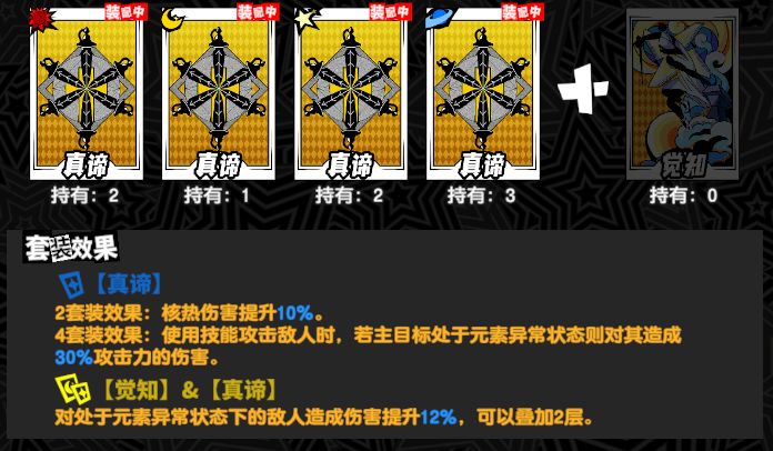 如果还有不清楚的地方,我可以用刚上线的新岛真来举例说明。目前新岛真的主流玩法是依靠队友先给敌人附加异常状态,从而叠加坚毅效果提升核热伤害。同时,他的技能包含不依赖暴击的额外伤害,因此启示卡推荐选择觉知和真谛组合。由于新岛真出手越晚效果越好,所以副词条无需优先速度,可选择提升伤害加成或攻击力的属性。