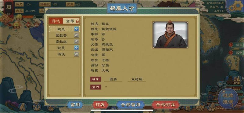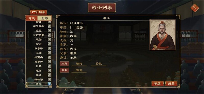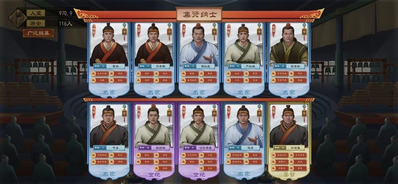 当国内人才吸引力达到一定水平,天下贤士将纷至沓来。游士中若有合适人选,玩家可尝试招募,但存在被拒绝的可能。