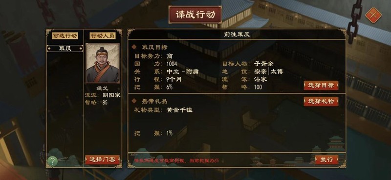 进入禁府或他国外交界面,选择谍战行动中的策反功能进行操作。