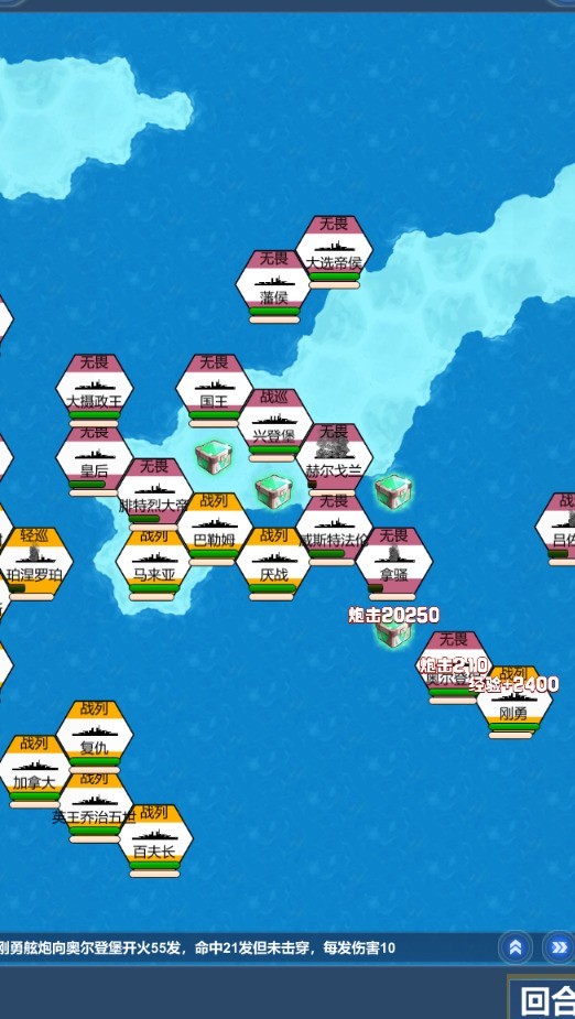 开局敌方阿金科特与一艘特四级超战率领众多小型舰只被困于港口,超战拥有460防御与457火力,我方常规510火力攻击效果甚微;另有八座防御415、火力457的岸防炮台。友军包含四座要塞舰,火力440、防御405,另配两艘重航,雷击415、轰炸320。第三回合末至第四回合初,右下角将分别刷新8艘驱逐与4艘装甲航母。