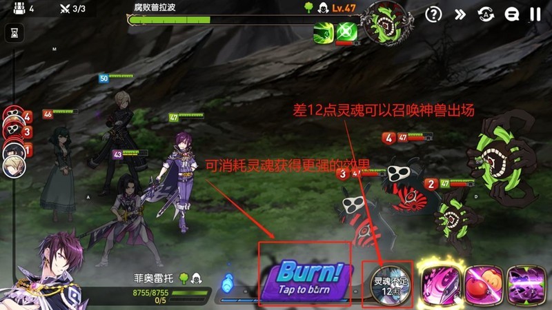 总结灵魂可用于提升英雄的伤害效果,或用于召唤神兽进行攻击。神兽消耗灵魂较多,登场速度较慢,其设计目的是防止玩家在同一个关卡中反复作战,可视为一种终结手段,有助于快速结束冗长的战斗回合。