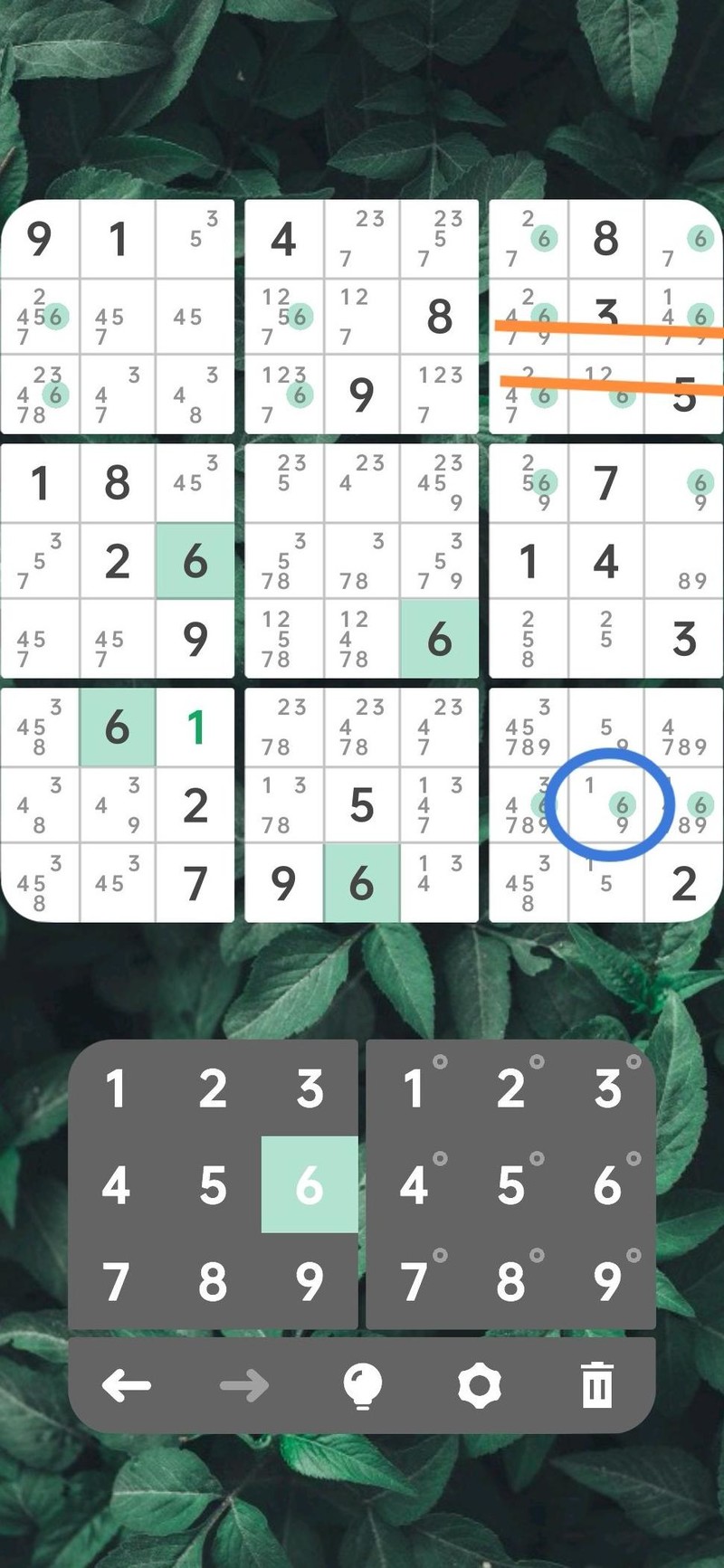 由于当前右起第二列仅剩一个6,可确定右下区域中6的具体位置。