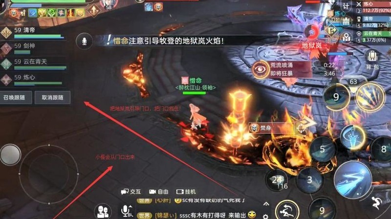 当Boss血量降至70%时,会从门口召唤一批小怪。此时被点名的玩家需将地狱岚的火焰引导至门口,封锁通道并焚灭小怪,机制与历险难度一致,重点在于及时封路阻止敌人推进。