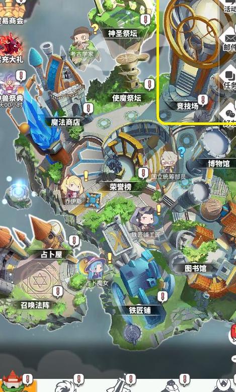 通过2-35关卡后,主城右上角将解锁竞技场建筑,具体位置见图示黄框区域。