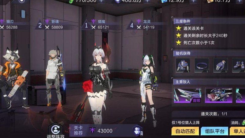 单人匹配建议上阵龙灵、猎魔、斩魂、狼刃,若缺少角色可用影舞替代,并手动操作龙灵以提升战斗表现。