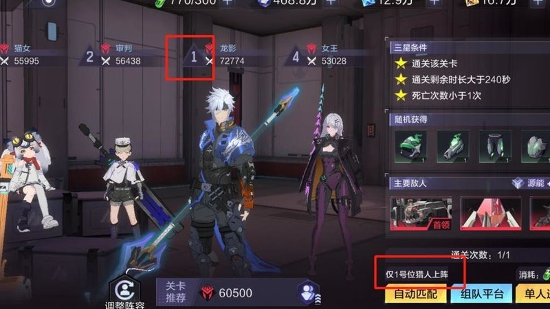 单人匹配建议上阵,若未拥有可替换为,并手动操控以提升战斗表现。