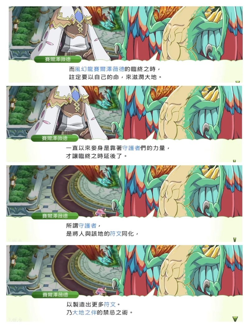 随着剧情推进,因赛尔菲亚符文逐渐枯竭,风幻龙面临消亡。为守护它,四位朋友以元素魔法融合符文,献出自身力量。主角借助大地之伴的力量将他们解救。为避免悲剧重演,风幻龙忍痛抹去他们关于自己的记忆,让他们在遗忘中获得新生,继续前行于没有过往羁绊的世界之中。