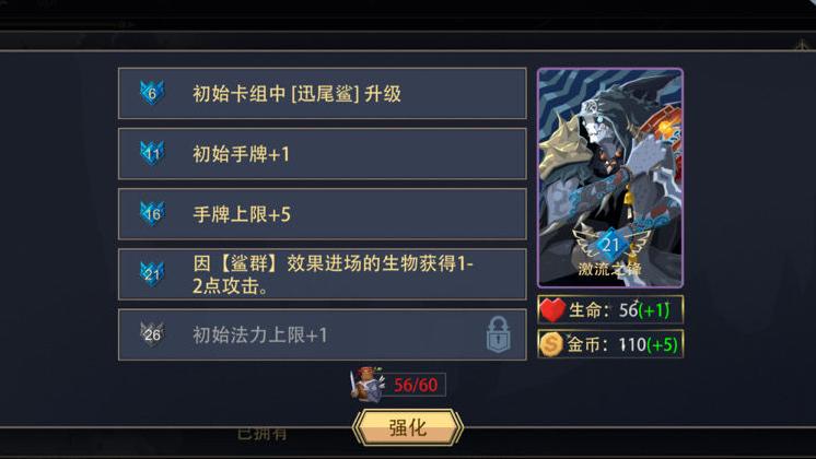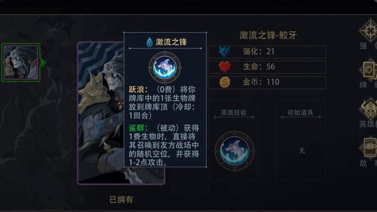 被动技能可使除初始手牌外所有一费生物自动登场,配合主动技能便于前期迅速铺场。专属卡鲨鱼具备速攻属性,角色达到21级后解锁鲨群效果,通关便水到渠成。