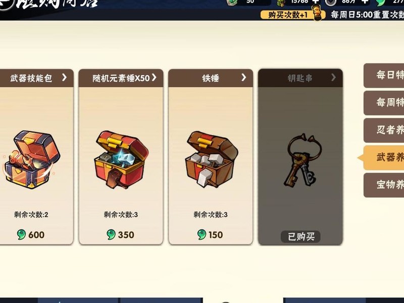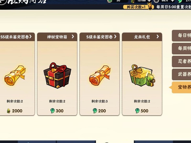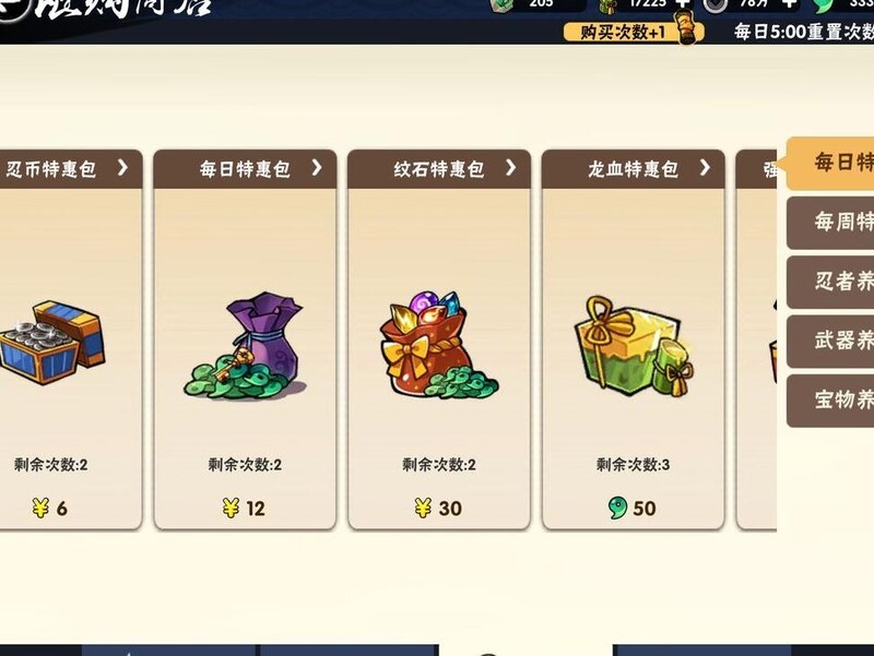 资金有限又想快速获取忍币、龙血、金钥匙等奖励,建议关注限购商店的每日限购商品,长期积累也能收获颇丰。
