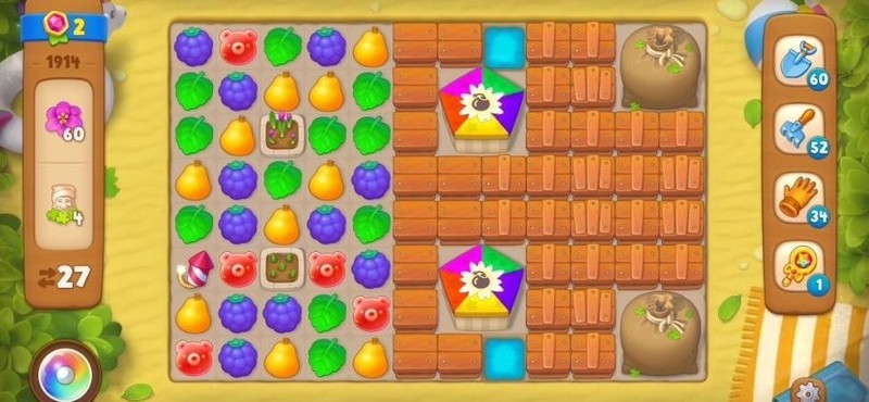 炸药箱共有四种颜色,每个面需与对应颜色的元素匹配才能消除。例如,黄色面需用黄色梨元素进行交换,使其变为白色。当四个面全部变为白色时,炸药箱便会爆炸,大范围清除障碍物,帮助顺利通关。