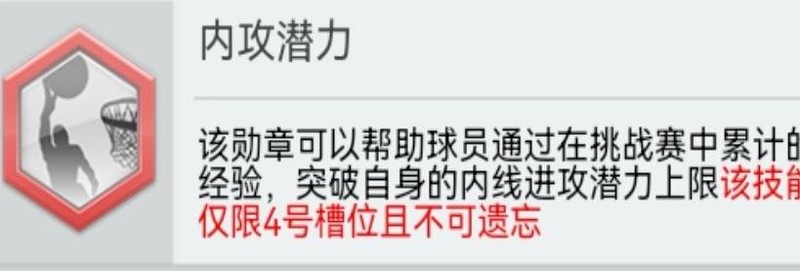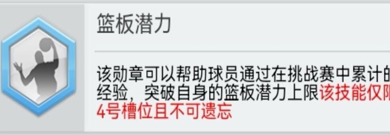 限定位置勋章,仅限四章使用且不可卸下,专为氪金玩家打造,提升球员篮板潜力,弥补天赋短板。