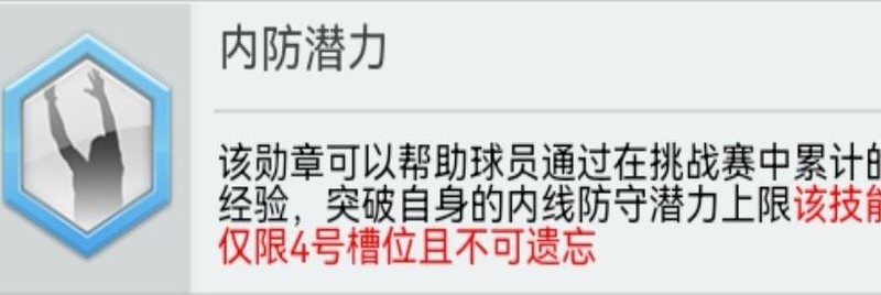 限定位置徽章,仅限四位置使用且不可卸下,专为高投入玩家设计,提升球员内线防守潜力,弥补先天属性短板。