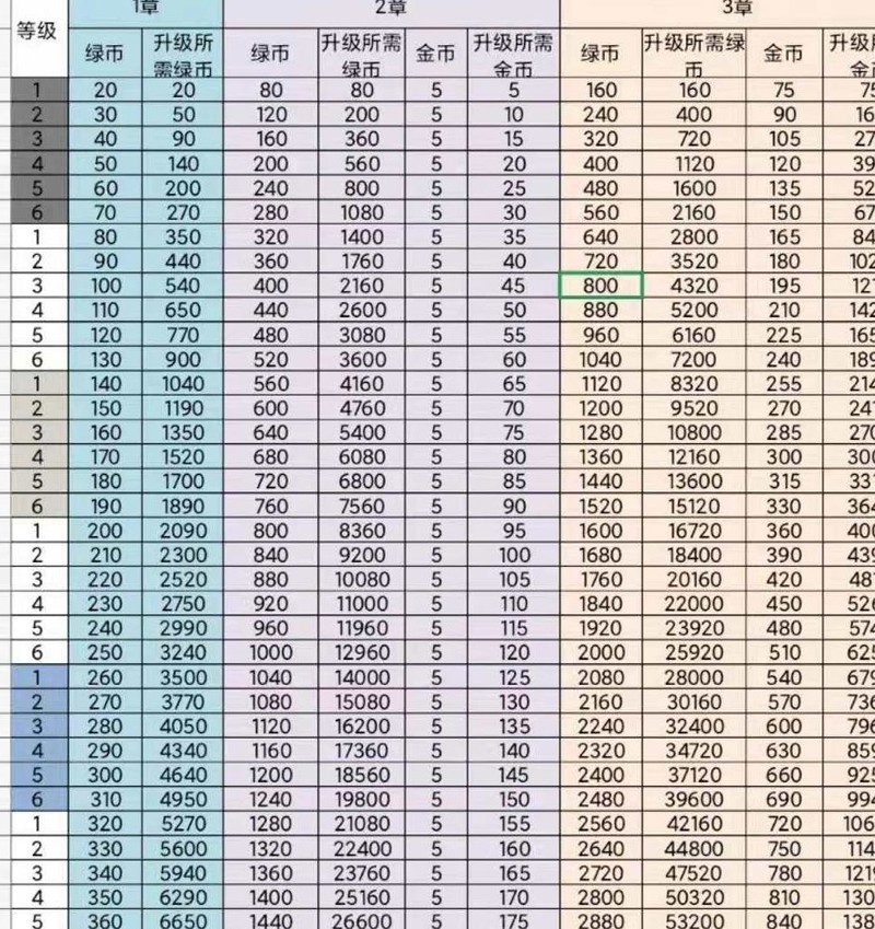 前三章通关资源消耗汇总:第一章需7020个绿币;第二章需2.8万个绿币和18万金币;第三章则需5.6万个绿币及1471万金币。数据由资深玩家整理,绿币以个为单位,金币以千为单位,供参考规划资源分配。