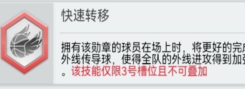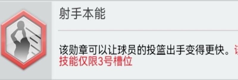 提升球员出手速度,间接提高命中率,对内线强打型球员效果有限。仅可镶嵌于三章位,常与增益类技能章二选一,更适合以中远投为主要进攻方式的三二突破或三突型球员使用。