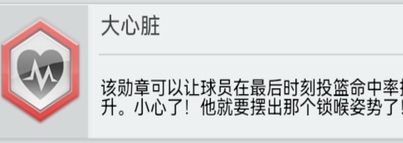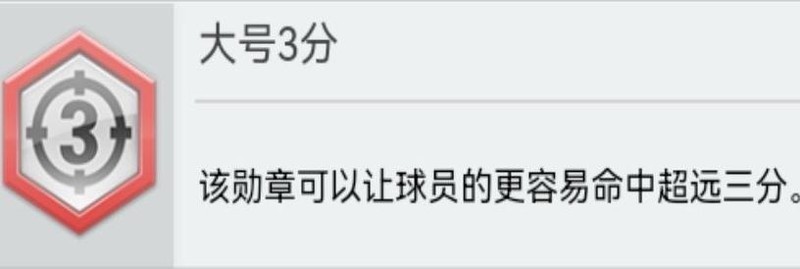 提升球员三分命中率的有效选择,适用于三二突或三突配置。因三章与四章的特殊限制,勋章难以兼顾全面,故三分章一般不作为首选方案。
