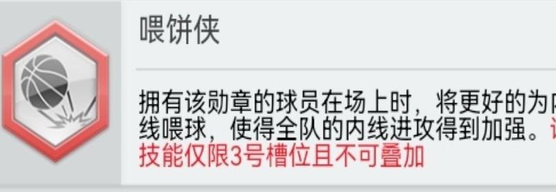 限定位置徽章,仅限佩戴三个。团队增益类,球员上场时激活,增强场上五人内线进攻能力,普遍由首发与替补球员使用。
